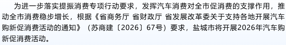 最高7000元!盐城市2026年汽车购新促消费政策来了