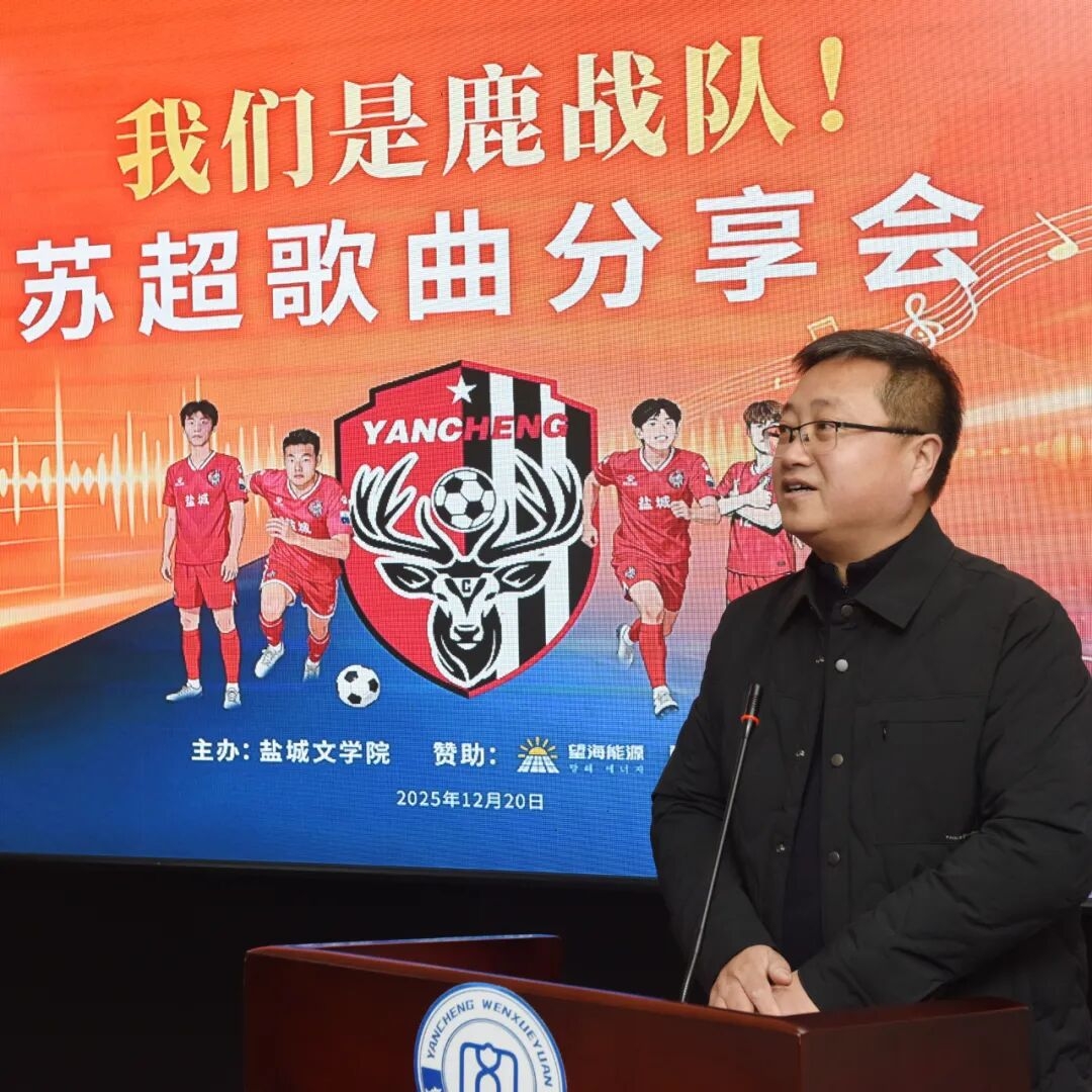 12月20日,“我们是‘鹿战队’—— 苏超歌曲分享会” 在盐城文学院温情启幕。作为深耕盐南、与这片土地有着深厚羁绊的本土创作者,被大家亲切称为 “伍佑大叔” 的歌曲策划人、盐城文学院副院长陈雨刚,2024年便在伍佑珠溪古镇创立了个人音乐工作室,还为古镇量身打造了主题推广歌曲《伍佑无虑》,将家乡的烟火气息与人文底蕴揉进旋律里。如今,他依旧带着对盐南的赤诚热爱,现场分享《我们是 “鹿战队”》的创作心路,让这首点燃苏超赛场的金曲背后,城市与足球的深情联结再度引发共鸣。从赛场欢呼到全网热议,从单曲爆红到系列创作,《我们是 “鹿战队”》不仅成为盐城队的精神图腾,更催生了席卷全城的 “苏超鹿战队现象”,让足球文化与城市情怀深度交融,也让盐南的本土力量通过旋律被更多人看见。