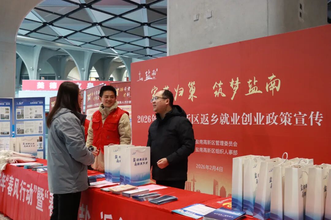 2月4日下午,盐城高铁站西广场暖意融融,我区2026年迎新春返乡就业创业政策宣传专场活动圆满落幕。这场专为归乡游子打造的“家门口”政策直达服务,以政策宣讲为核心、安居服务为支撑、新春祝福为纽带,让“就业有扶持、创业有保障、安居有着落”的盐南承诺直抵人心。