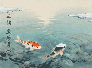 三候鱼儿向上游动,背负着冰面。此时河里的冰开始融化,鱼儿游动时好像是在背着冰块一样。陟,就是上升的意思。鱼在严寒的时候潜伏在水底而后感到温暖,到正月阳气到来,就向上游,游到靠近冰面的地方,所以叫“负”。