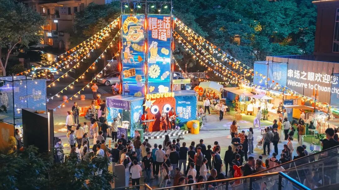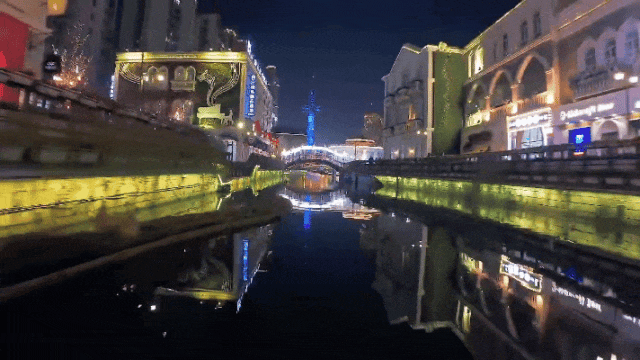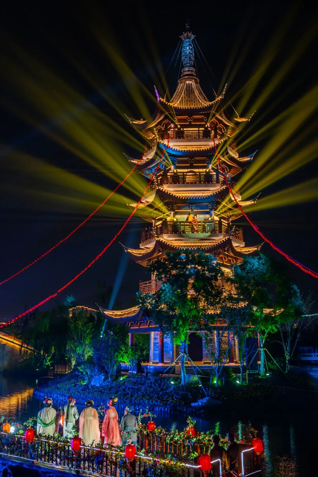 沿河排列的文创长廊,灯笼倒映粼粼波光