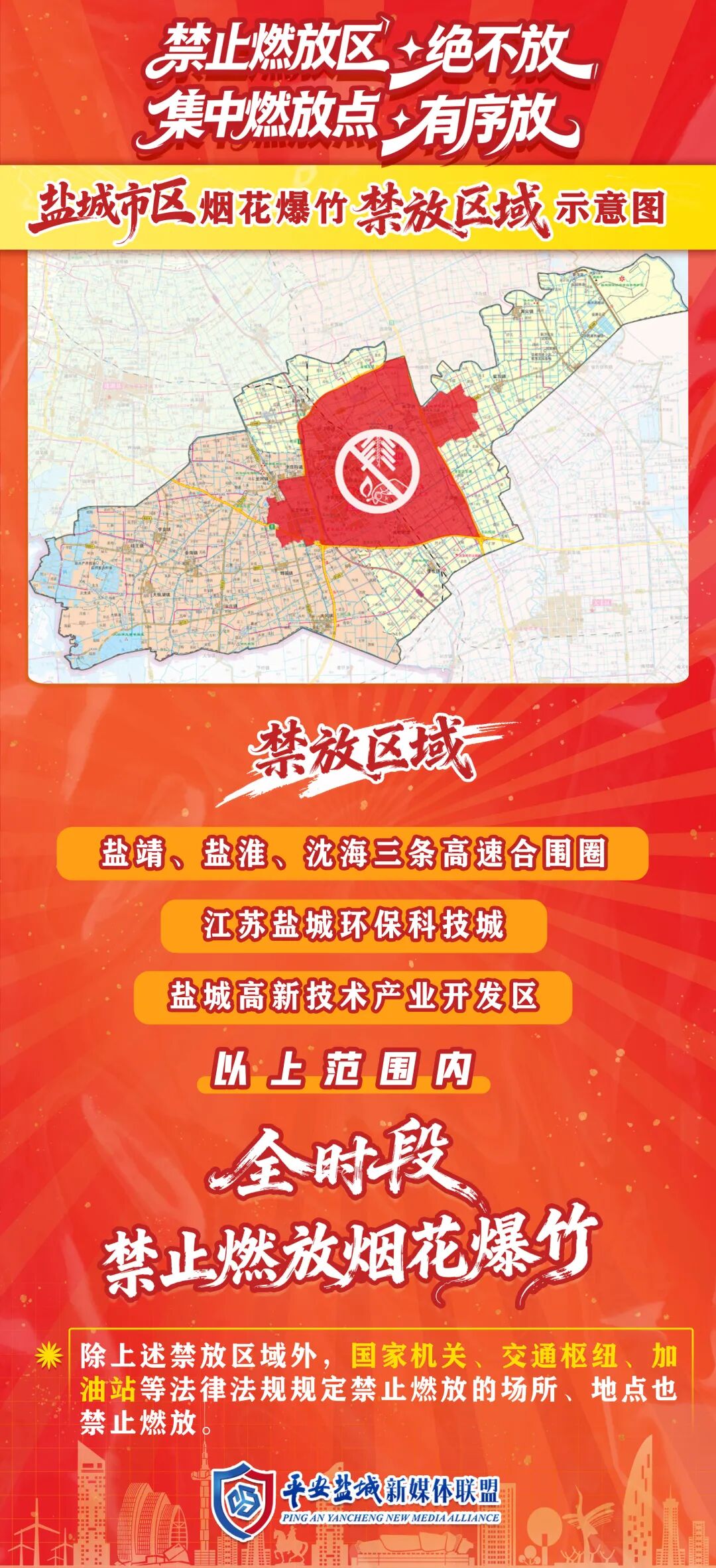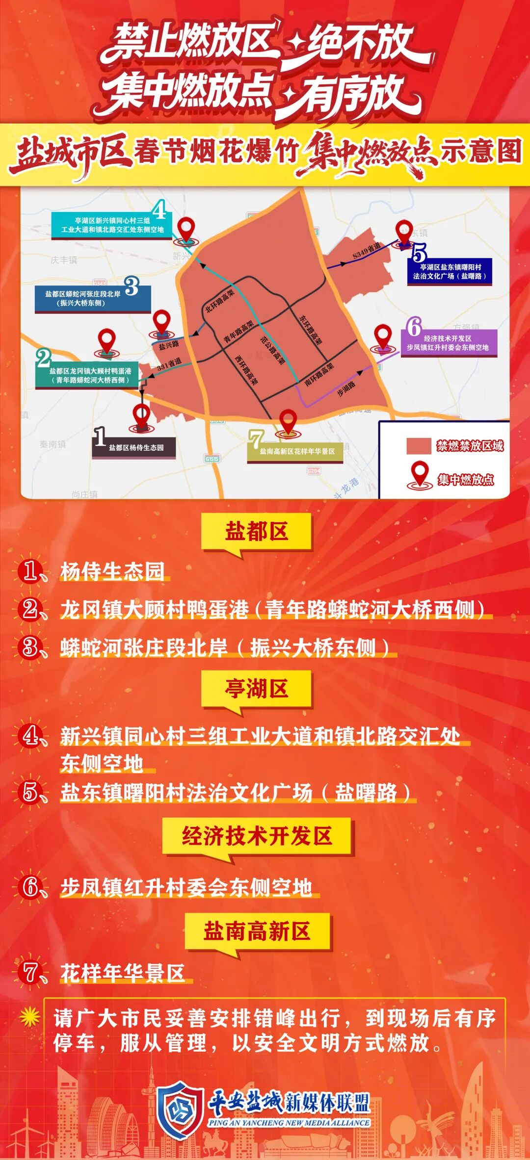 对343国道与科技路(禁止机动车向南通行)、西环路与龙园道(禁止机动车向东通行)实行交通管制。同时,根据周边道路通行情况,对西环路(343国道至204国道)、西环路高架(新都枢纽至盐城南高速出口)实行临时交通管制。管制区域内,除执行紧急任务的车辆外,其他车辆禁止通行。