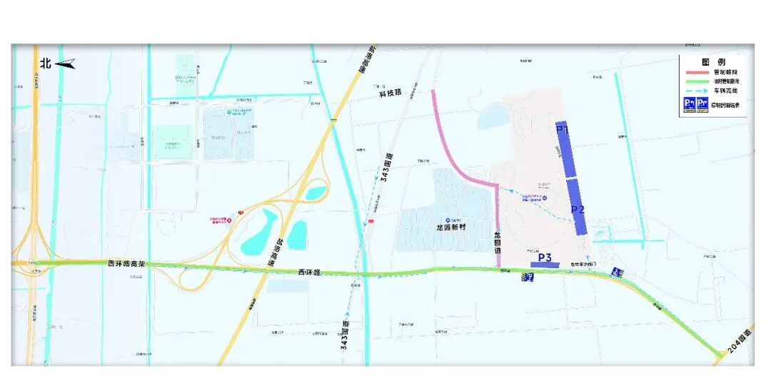 景区内设2处社会停车场(P1、P2),龙园道、西环路(343国道至花样年华西门)全线禁止机动车停放,管制区域内的市民,建议前往343国道的选择科技路通行;前往西环路的选择龙园道通行。