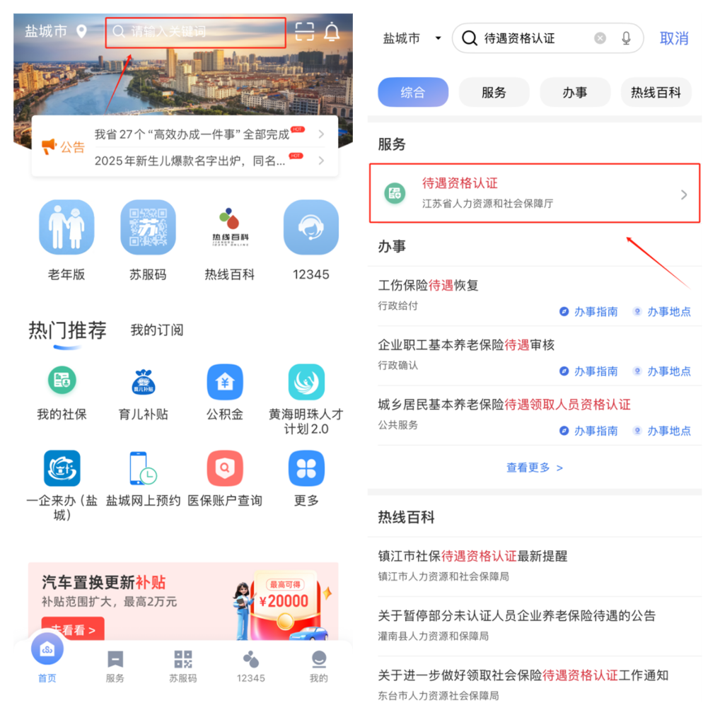 ①打开“苏服办”APP,在首页搜索“待遇资格认证”,进入服务。