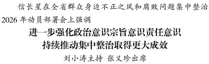 2月25日,全省群众身边不正之风和腐败问题集中整治2026年动员部署会召开。省委书记信长星出席会议并讲话。他强调,要深入学习贯彻习近平总书记在二十届中央纪委五次全会上的重要讲话精神,落实中央纪委国家监委部署要求,进一步强化政治意识、宗旨意识、责任意识,以更高标准、更实举措推进集中整治,务求取得更大成效、赢得群众认可。省长刘小涛主持会议。省政协主席张义珍出席会议。
